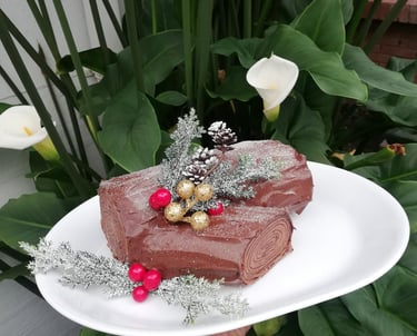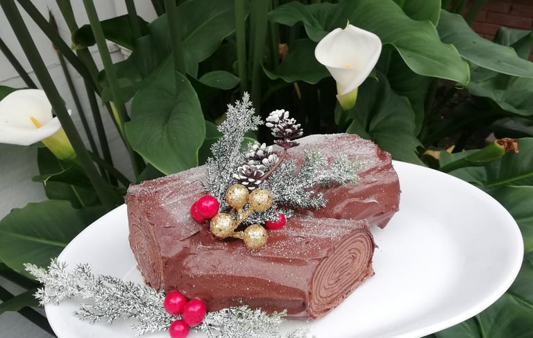 Tronco Navideño de Chocolate: Un postre festivo y elegante, construido capa a capa con crepes.